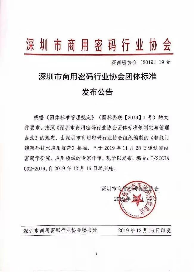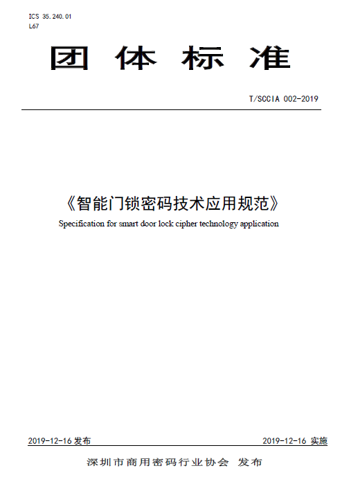 于12月16日開始正式實施。該標準規范了智能門鎖?行業密碼應用流程,給出了國產商用密碼安全分級與應用要求,填補了智能門鎖國產商用密碼標準的空白,有利于智能門鎖行業的應用和推廣。">